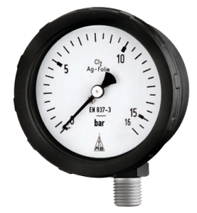 Diaphragm pressure gauges with vertical diaphragm model PsPK 63-2 have been developed for the application in chlorine metering services. The lower part of the diaphragm with the connection thread is made of steel. The wetted parts are not enamelled. The diaphragm is protected by a fine silver foil which is applicable for use under vacuum. The case made of impact resistant polyamide with screw ring protects the inner parts from all external harmful influences (chloric gas).